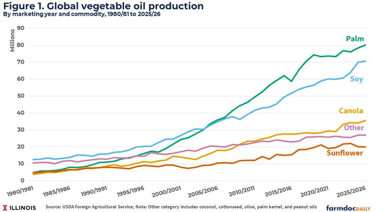 Autrefois, ces deux huiles, quasi-substituables et représentant plus de 60 % de l'approvisionnement mondial en huiles comestibles, évoluaient de concert, avec des écarts de prix stables. Le principal facteur de divergence actuel réside dans les différences de répartition géographique et de politiques de production : la production d'huile de palme est fortement concentrée en Indonésie et en Malaisie, la majeure partie étant consommée pour l'alimentation et la production de biodiesel. La production d'huile de soja, concentrée aux États-Unis, au Brésil et en Argentine, est plus dispersée et de plus en plus influencée par les politiques nationales en matière de biocarburants, qui soutiennent l'approvisionnement national.