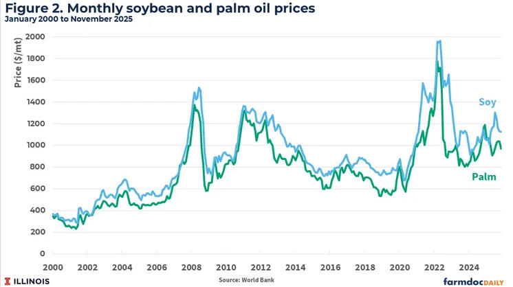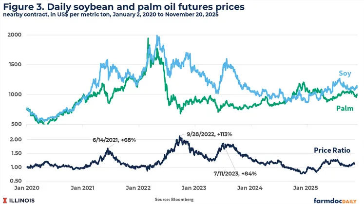 Parmi les événements marquants de cette divergence, on peut citer : la forte augmentation, en 2021, de la capacité de production de diesel renouvelable aux États-Unis, qui a fait grimper les prix de l'huile de soja bien au-delà de ceux de l'huile de palme ; En 2022, les prix de l'huile de palme ont chuté suite à la levée de l'interdiction d'exportation indonésienne, tandis que ceux de l'huile de soja ont baissé plus lentement. La volatilité qui a suivi a été alimentée par les aléas climatiques liés au soja américain et par les ajustements des quotas et crédits d'impôt pour les biocarburants.