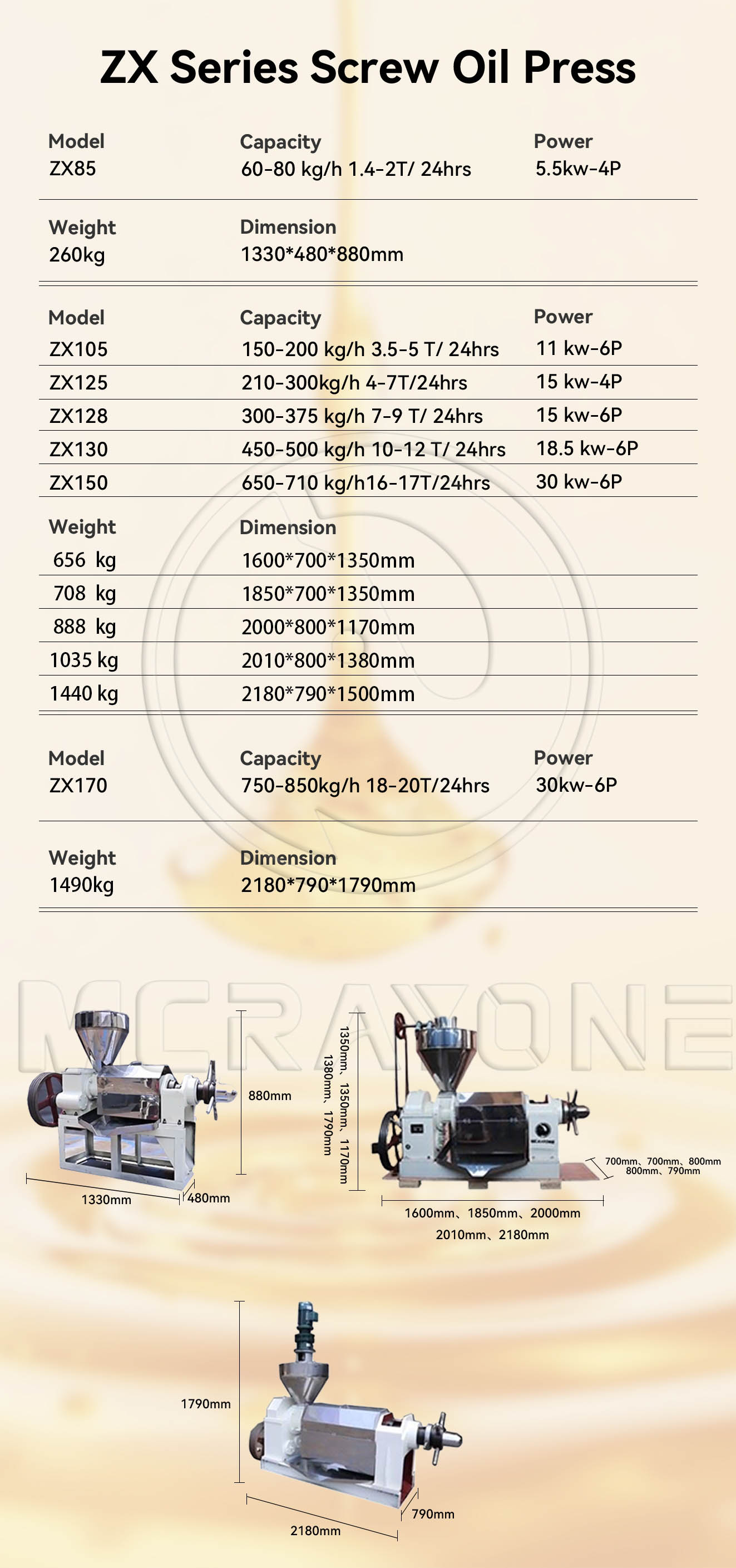 Équipée d'un corps robuste, d'une vis en acier à haute résistance et d'un réducteur fiable, la série ZX offre des performances stables et peut fonctionner en continu pendant de longues heures. Elle s'adresse aussi bien aux petites et moyennes huileries, aux ateliers artisanaux qu'aux familles, leur permettant de produire une huile de sésame pure, saine et sans additifs, en toute simplicité et sérénité.